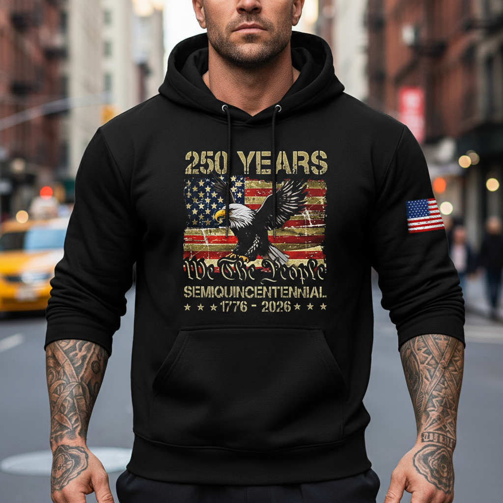 • Detail Features: Front Graphic Print with Eagle and American Flag, Sleeve Patch Flag, Drawstring Hood, Kangaroo Pocket