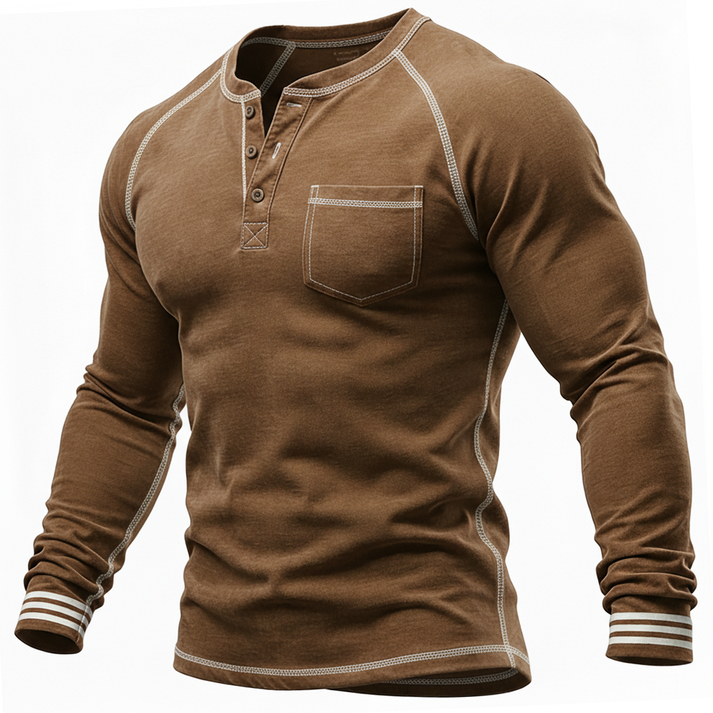 Men's Caramel Henley Top With Contrast Stitching & Striped Cuffs