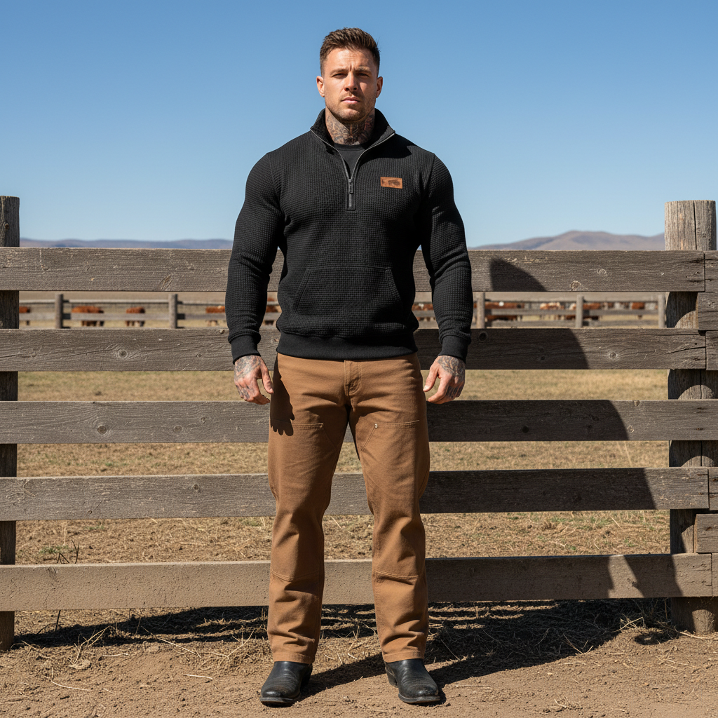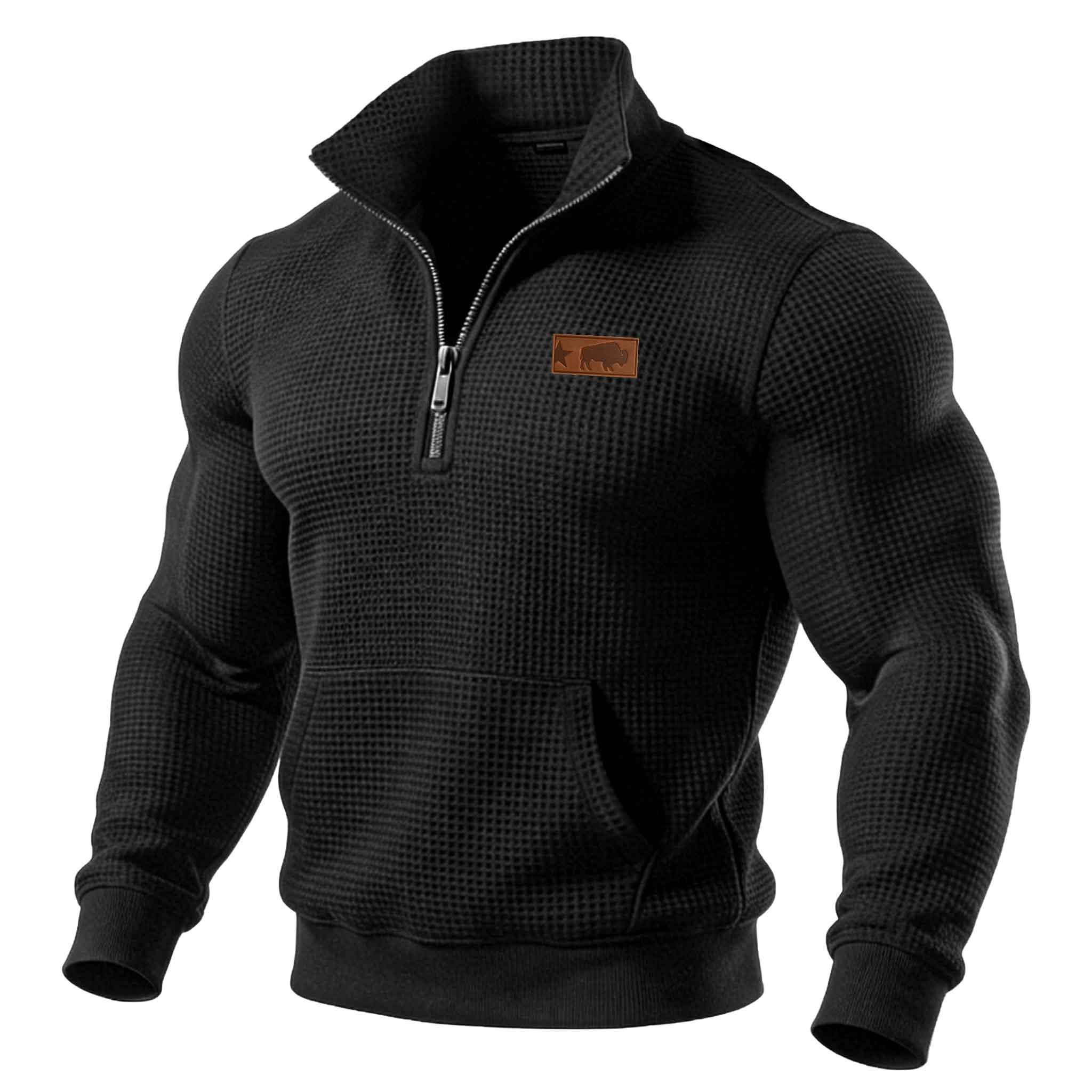 Men's Vintage Western Cowboy Leather Patch Waffle Knit Quarter-Zip Stand Collar Sweatshirt